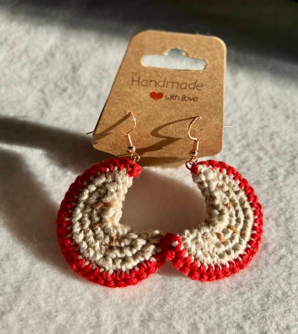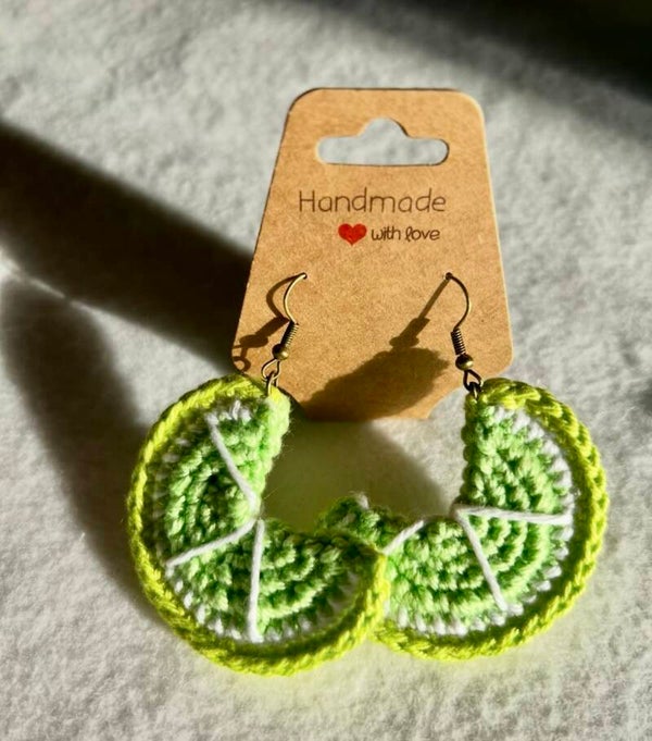 Les boucles d'oreilles fruits sont réalisées avec du coton, des perles de plastique et des attaches en acier inoxydable.